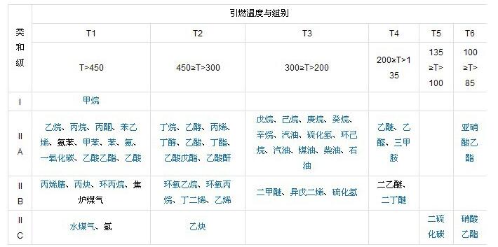 爆炸性氣體混合物分類按其最大試驗安全間(jiān)隙的大小分爲 IIA、IIB、IIC 三級(jí);按引燃溫度的高低,分爲 T1、T1、T3、T4、T5、T6 六組。...